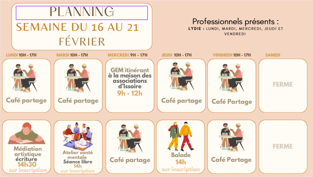 Lundi 23 février : nous sommes invité par la médiathèque de Jaude à bénéficier d’un don de livres. Rendez-vous pour ceux qui le souhaite à la médiathèque, 9 place louis Aragon (derrière le centre Jaude) de 9h à 12h pour sélectionner les ouvrages qui nous intéressent. Lundi matin, Lydie ne sera donc pas dans les locaux du GEM, mais à la médiathèque.