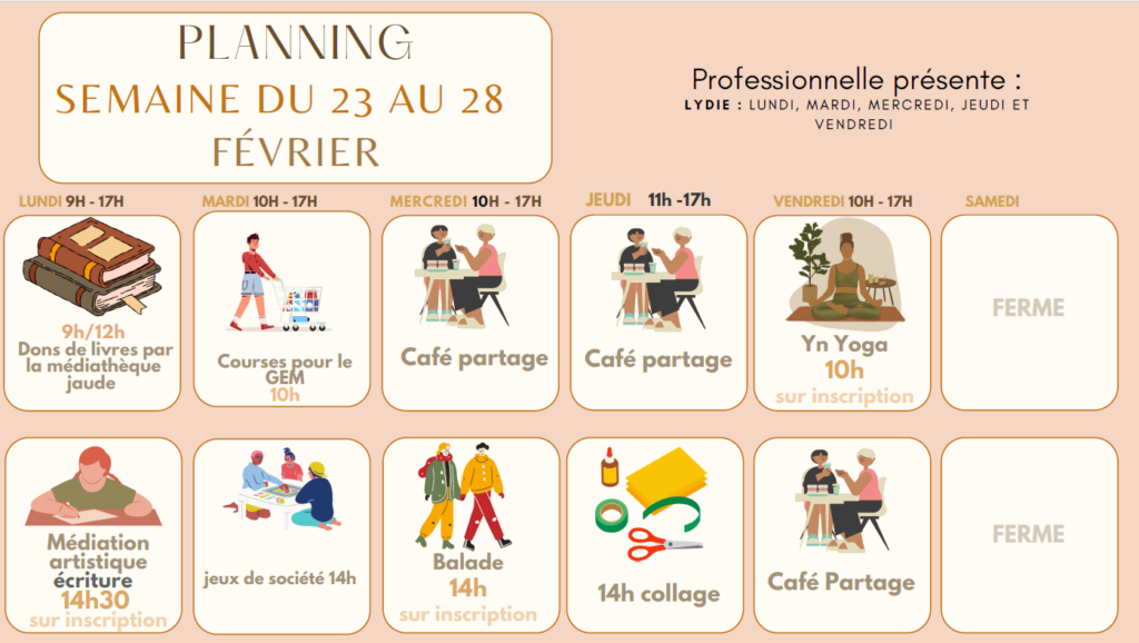 Merci de vous inscrire via l’onglet planning si vous souhaitez participer aux ateliers : Médiation artistique, Yn Yoga, balade.