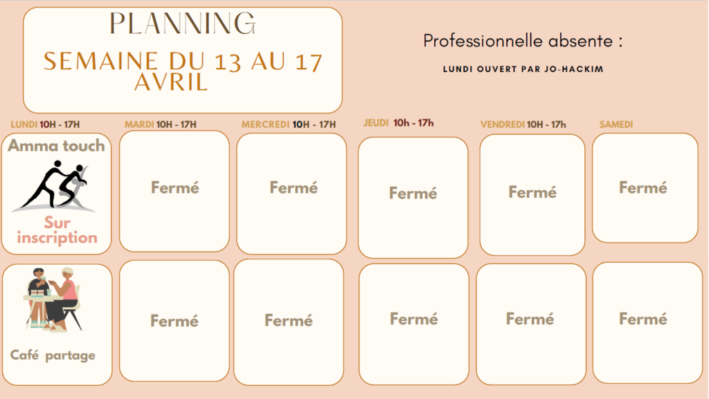 Jours d’absence de la Professionnelle : Les jours où la professionnelle n’est pas en service, le GEM est fermé.