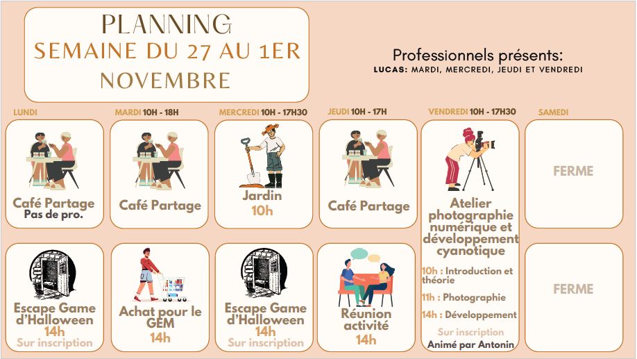 Merci de vous inscrire via l’onglet planning si vous souhaitez participer aux ateliers : Escape Game d’Halloween, atelier photographie