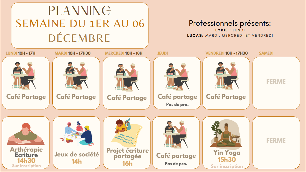 Merci de vous inscrire via l’onglet planning si vous souhaitez participer aux ateliers : Arthérapie, Pâtisserie et Yn Yoga