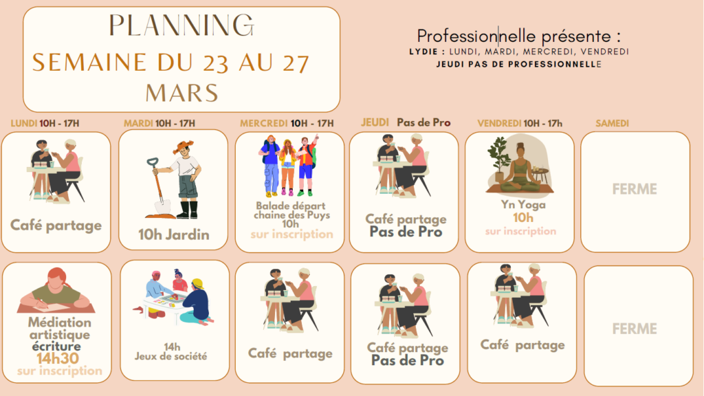 Merci de vous inscrire via l’onglet planning si vous souhaitez participer aux ateliers : Médiation artistique, Yn Yoga, et balade.