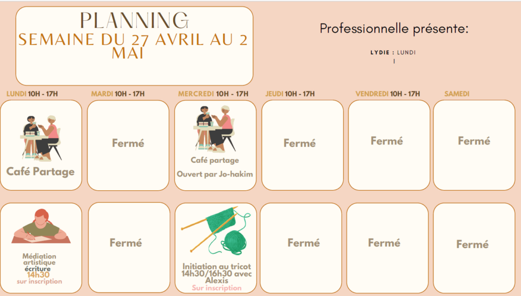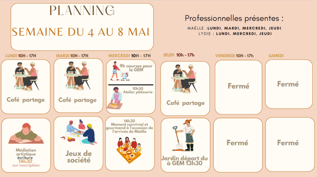 Jours d’absence de la Professionnelle : Les jours où la professionnelle n’est pas en service, le GEM est fermé.